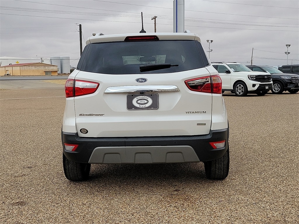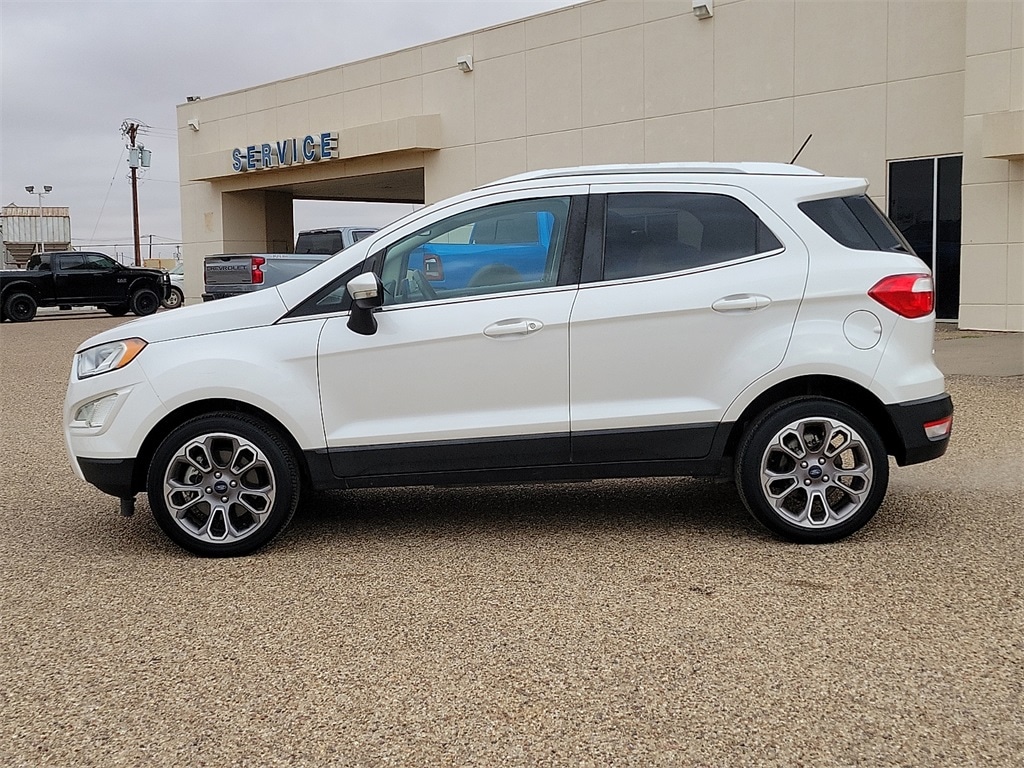 This 2020 Ford EcoSport Titanium EcoBoost 1.0L I3 GTDi DOHC Turbocharged VCT 6-Speed Automatic FWD in White Platinum comes with the following features: Equipment Group 400A, 10 Speakers, 3.44 Axle Ratio, 4-Wheel Disc Brakes, ABS brakes, Air Conditioning, Alloy wheels, AM/FM radio: SiriusXM, AppLink/Apple CarPlay and Android Auto, Auto-dimming Rear-View mirror, Automatic temperature control, Brake assist, Bumpers: body-color, Compass, Delay-off headlights, Driver door bin, Driver vanity mirror, Dual front impact airbags, Dual front side impact airbags, Electronic Stability Control, Emergency communication system: SYNC 3 911 Assist, Exterior Parking Camera Rear, Front anti-roll bar, Front Bucket Seats, Front Center Armrest, Front fog lights, Front reading lights, Front wheel independent suspension, Fully automatic headlights, Heated door mirrors, Heated front seats, Heated steering wheel, Illuminated entry, Knee airbag, Leather Shift Knob, Leather steering wheel, Low tire pressure warning, Navigation System, Occupant sensing airbag, Outside temperature display, Overhead airbag, Overhead console, Panic alarm, Passenger door bin, Passenger vanity mirror, Perforated Leather-Trimmed Heated Bucket Seats, Power door mirrors, Power driver seat, Power moonroof, Power steering, Power windows, Radio data system, Radio: AM/FM Stereo w/MP3 Capable, Rain sensing wipers, Rear Parking Sensors, Rear seat center armrest, Rear side impact airbag, Rear window defroster, Rear window wiper, Remote keyless entry, Roof rack: rails only, Security system, SiriusXM Radio, SiriusXM Traffic & Travel Link, Speed control, Speed-sensing steering, Split folding rear seat, Steering wheel mounted audio controls, SYNC 3 Communications & Entertainment System, Tachometer, Telescoping steering wheel, Tilt steering wheel, Traction control, Trip computer, Turn signal indicator mirrors, Variably intermittent wipers, and Wheels: 17" Premium Dark Stainless-Painted.