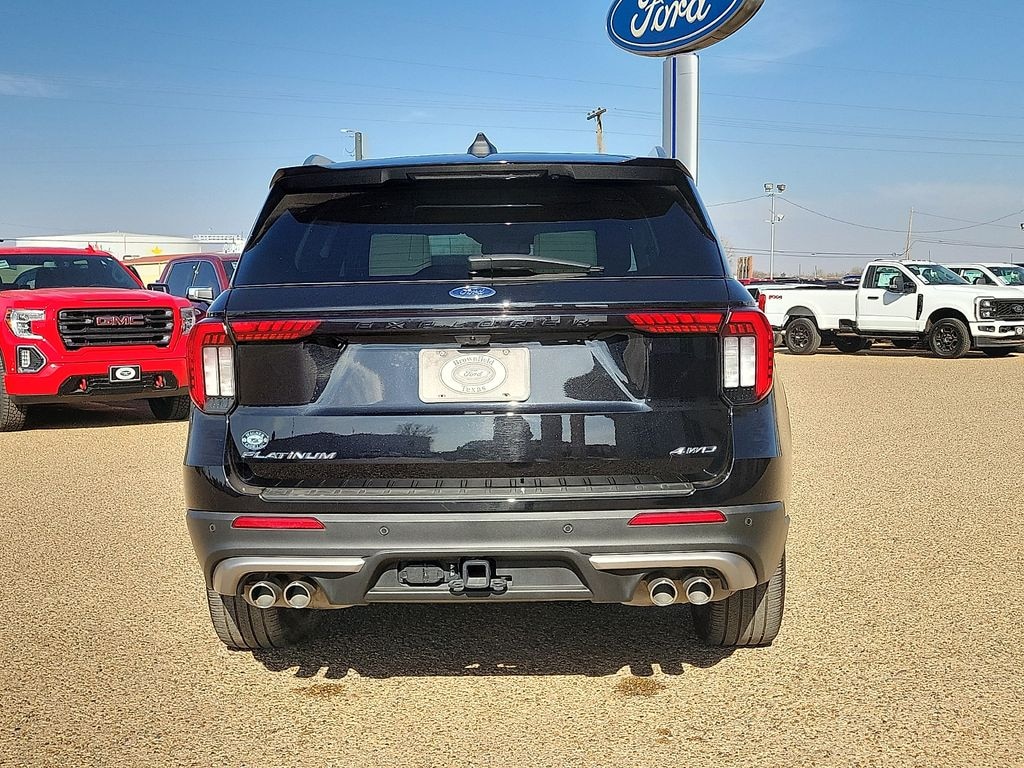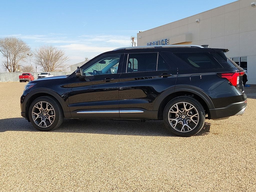 This 2025 Ford Explorer Platinum 3.0L EcoBoost V6 10-Speed Automatic 4WD in Black Metallic comes with the following features: 4WD Equipment Group 600A Standard Package, Lux Leather Package (Leather Seating Surfaces Sport Captain Chairs, Platinum Badges on Front Row Seats, Quilting & Stitching on Door Panels, and Quilting & Stitching on Seats), Ultimate Package (Wheels: 21" Dark Alloy-Painted Machined Aluminum), 4WD, 14 Speakers, 3.58 Non-Limited Slip Rear Axle, 3rd row seats: bench, 4-Wheel Disc Brakes, ABS brakes, ActiveX Trimmed Sport Captain's Chairs, Air Conditioning, Alloy wheels, AM/FM radio: SiriusXM with 360L, Apple CarPlay/Android Auto, Auto High-beam Headlights, Auto-dimming door mirrors, Auto-dimming Rear-View mirror, Automatic temperature control, Brake assist, Bumpers: body-color, Compass, Delay-off headlights, Driver door bin, Driver vanity mirror, Dual front impact airbags, Dual front side impact airbags, Electronic Stability Control, Emergency communication system: 911 Assist, Exterior Parking Camera Rear, Ford BlueCruise Equipped (1-Year Plan) (DISC), Four wheel independent suspension, Front anti-roll bar, Front Bucket Seats, Front Center Armrest, Front dual zone A/C, Front fog lights, Front License Plate Bracket, Front reading lights, Fully automatic headlights, Garage door transmitter, Heated door mirrors, Heated front seats, Heated rear seats, Heated steering wheel, Illuminated entry, Internet access capable: FordPass Connect 5G, Knee airbag, Leather steering wheel, Low tire pressure warning, Memory seat, Navigation System, Occupant sensing airbag, Outside temperature display, Overhead airbag, Overhead console, Panic alarm, Passenger door bin, Passenger vanity mirror, Power door mirrors, Power driver seat, Power Liftgate, Power moonroof, Power passenger seat, Power steering, Power windows, Radio data system, Radio: B&O Sound System by Bang & Olufsen w/HD, Rain sensing wipers, Rear air conditioning, Rear anti-roll bar, Rear reading lights, Rear window defroster, Rear window wiper, Remote keyless entry, Security system, Speed control, Speed-sensing steering, Speed-Sensitive Wipers, Split folding rear seat, Spoiler, Steering wheel mounted audio controls, Tachometer, Telescoping steering wheel, Tilt steering wheel, Traction control, Trip computer, Turn signal indicator mirrors, Variably intermittent wipers, Ventilated front seats, and Wheels: 20" Luster Nickel-Painted Aluminum.